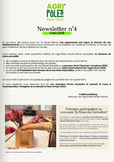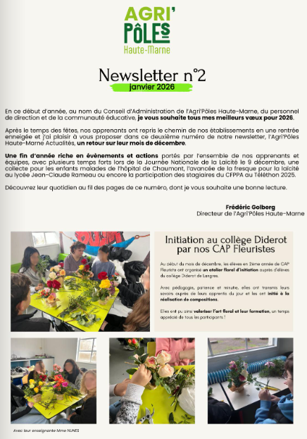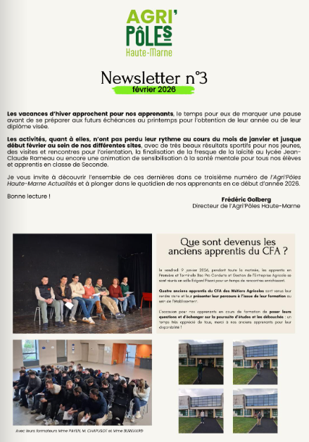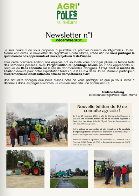 Depuis la fin d'année 2025, l'Agri'Pôles Haute-Marne, le regroupement des établissements d'enseignement agricole public de la Haute-Marne, a mis en place sa newsletter, l'Agri'Pôles Haute-Marne Actualités, pour partager le quotidien de ses apprenants (élèves, apprentis et stagiaires) et leurs projets au fil de l'année.
